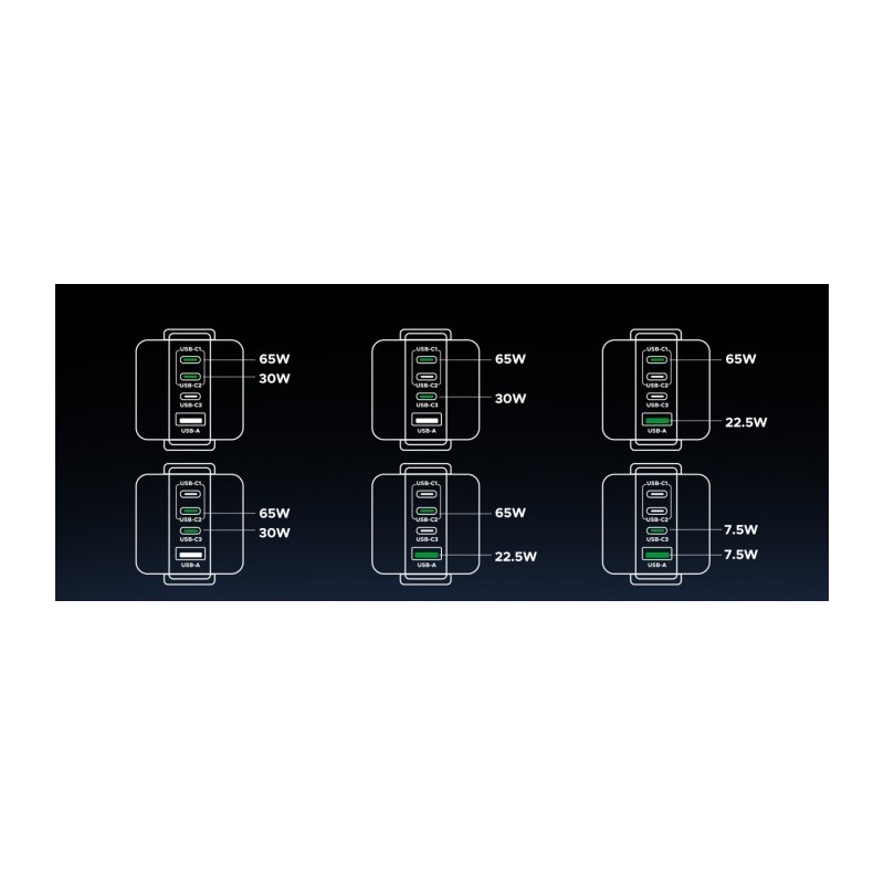 Polnilnik omogoča hkratno polnjenje do štirih naprav, saj ima 3 USB-C in 1 USB-A priključek. Skupna moč do 100 W omogoča hitro in varno polnjenje telefonov, tablic, prenosnikov in drugih naprav.