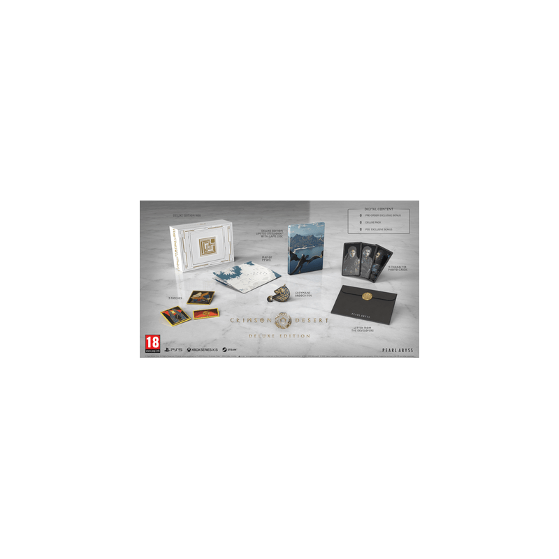 Celotna igra Crimson Desert Omejena jeklena škatla Deluxe Edition (SteelBook®) Zemljevid Pywela Pismo razvijalca Broška Greymane 3 foto kartice likov 3 našitki Vključuje tudi bonus DLC vsebine v igri:
