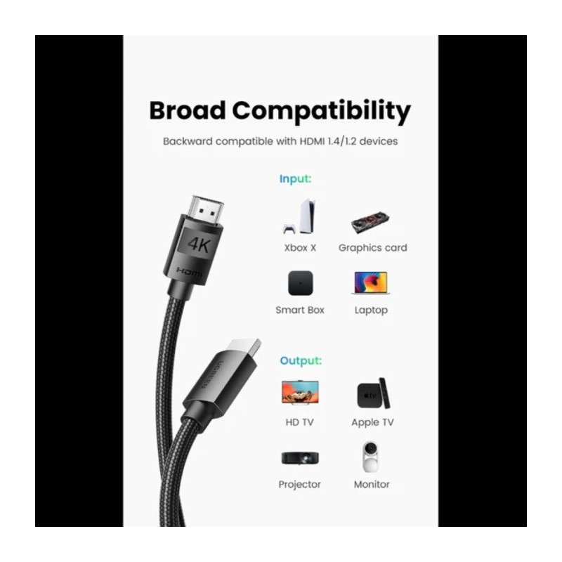 kabel UGREEN 4K HDMI 2.0 v celoti podpira visokokakovostno sliko 4:4:4 Chroma, HDR/HDR 10, 1080P HD, UHD in 1440p QHD. 4K HDMI HDR Lead ima 3D učinek, 48-bitno globoko barvo in način Mirror & Extend, podpira tudi monitor Full HD 16:9 in ultra-širok zaslon za igre 21:9. Kabel 4K HDMI UHD je idealen spremljevalec za hišni kino, igralne centre in konferenčne
