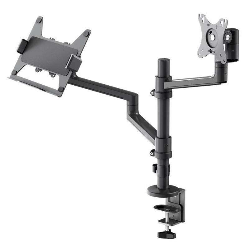 Serija Pro za profesionalni sektor: Robustno držalo za monitor s polico za prenosnik, ki ga lahko uporabite kot drugi monitor v pisarni in ga kadar koli vzamete na sestanek. Idealno za stabilno pritrditev na mizo zaslona do 8 kg in prenosnika do 5 kg, nastavljiva višina, vrtenje +-90° in nagibanje +90°/-30°, vrtenje 180°, priporočena debelina mizne plošče: 10-80 mm Oblazinjene vpenjalne čeljusti se lahko prilagodljivo prilagodijo velikosti prenosnika in zagotavljajo varen oprijem. Integriran sistem za upravljanje kablov na ročaju monitorja ščiti kable in ustvarja čist videz brez nereda kablov. Namestitev je hitra in enostavna s priloženim montažnim materialom, bodisi z vijakom z izvrtano luknjo bodisi z namizno sponko, ki jo je mogoče odstraniti. Nosilec monitorja je združljiv s standardoma VESA 75x75 mm in 100x100 mm Velikost zaslona: M (43-81 cm / 17-32")