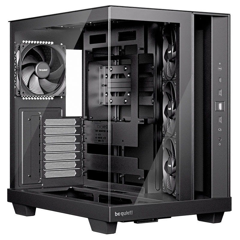 Kotni izvlečni okvir ventilatorja na strani usmerja zrak neposredno v grafični procesor Ventilatorje je mogoče namestiti v spuščen prostor za ventilatorje, da se popolnoma poravnajo z dnom ohišja 4 prednameščeni ventilatorji Pure Wings 3 120 mm PWM za izjemen pretok zraka Prostorna zasnova za radiatorje do 360 mm, matično ploščo ATX, 2 trda diska in 2 SSD diska hkrati 2 možna položaja napajalnika omogočata oporabo matičnih plošč skonektorji na zadnji strani Brez RGB za nevsiljiv in eleganten videz v vsaki sobi IZBOLJŠANA ELEGANCA - Kul dizajn, hladnejši grafični procesor