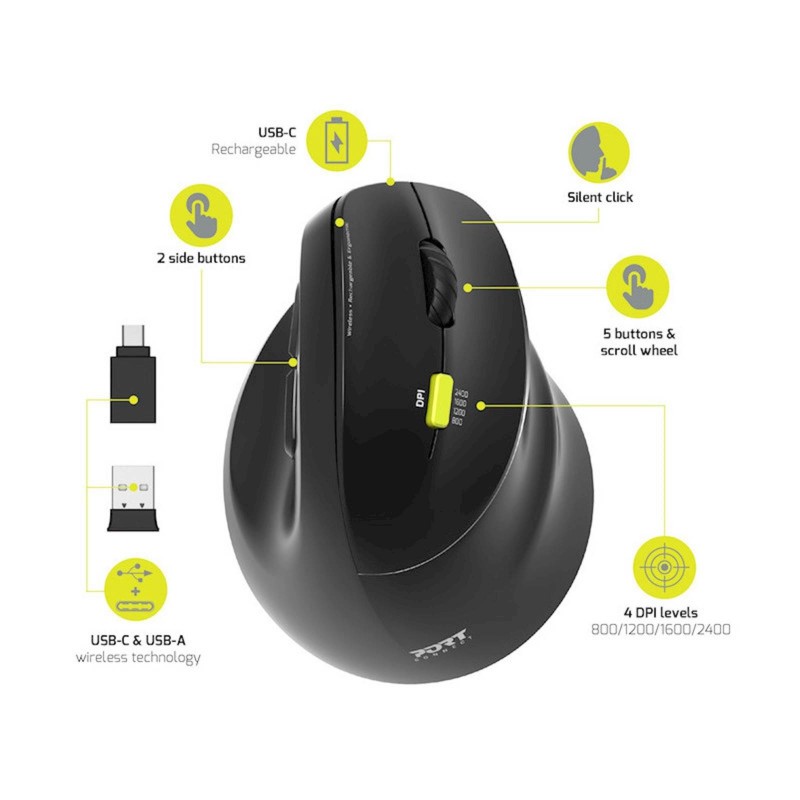 Ergonomska miška z nagnjeno obliko, izboljša udobje uporabe in zmanjša napetost zapestja in podlakti. Primerna le za desničarje. Opremljena je z brezžično tehnologijo 2,4 Ghz, Bluetooth®, z USB-A, USB-C sprejemnikom in polnilno baterijo ter USB polnilnim kablom. Njegov sistem »plug & play« omogoča hitro in enostavno uporabo. Izkoristite tudi nastavljiv optični senzor za optimalno natančnost: 800/1200/1600 DPI. Združljiva je z operacijskim sistemom Windows in Mac OS. Prevzemite nadzor s 5 tipkami in drsnim kolesom: desni / levi klik, sredinski in naprej / nazaj.