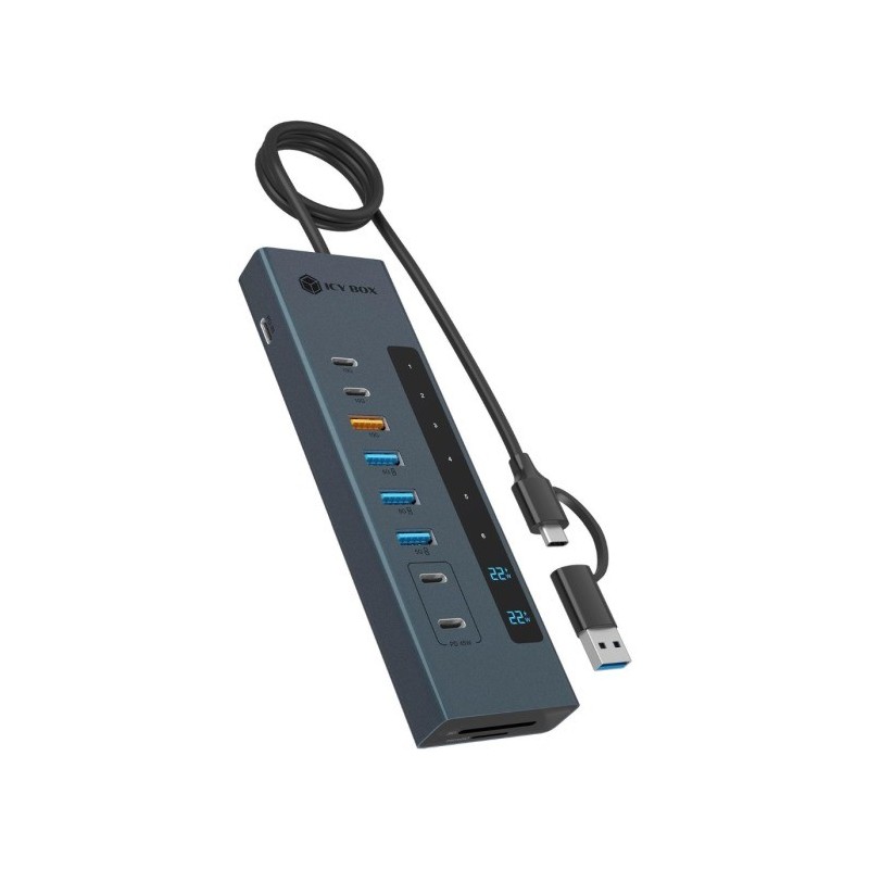 IB-HUB1742CR-C2PD je 11-v-1 USB-C razširitvena enota, namenjena uporabnikom, ki potrebujejo več priklopov in zanesljivo upravljanje napajanja v enem kompaktnem dodatku. Hub vključuje dva USB-C in en USB-A priključek s hitrostmi do 10 Gbit/s ter vgrajena SD in microSD čitalnika s prenosom do 104 MB/s, kar omogoča hitro delo z zunanjimi pomnilniki in dodatno opremo. Ohišje iz aluminija zagotavlja trpežnost ter učinkovito odvajanje toplote. Naprava ponuja dva USB-C Power Delivery izhoda z močjo do 22 W vsak oziroma do 45 W pri uporabi enega samega porta, medtem ko vhodni USB-C priključek podpira do 100 W prenosa napajanja za polnjenje prenosnikov. Integrirani LED zaslon prikazuje trenutno porabo v vatih in omogoča boljši nadzor upravljanja moči pri povezanih napravah. Vgrajeni kabel s priloženim USB-C na USB-A adapterjem omogoča preprosto povezovanje tako s prenosniki USB-C kot z napravami, ki uporabljajo USB-A. Hub deluje brez dodatnih gonilnikov in je združljiv z operacijskima sistemoma Windows in macOS, kar omogoča zanesljivo uporabo v najrazličnejših delovnih