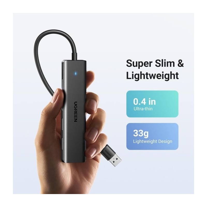 USB hub je zasnovan zelo kompaktno in je izjemno lahek, saj meri le 0,4 palca v debelino in tehta 33 gramov. Zaradi svoje majhnosti je idealen za potovanja in poslovne poti, saj zavzame malo prostora in ga lahko enostavno nosite s seboj.