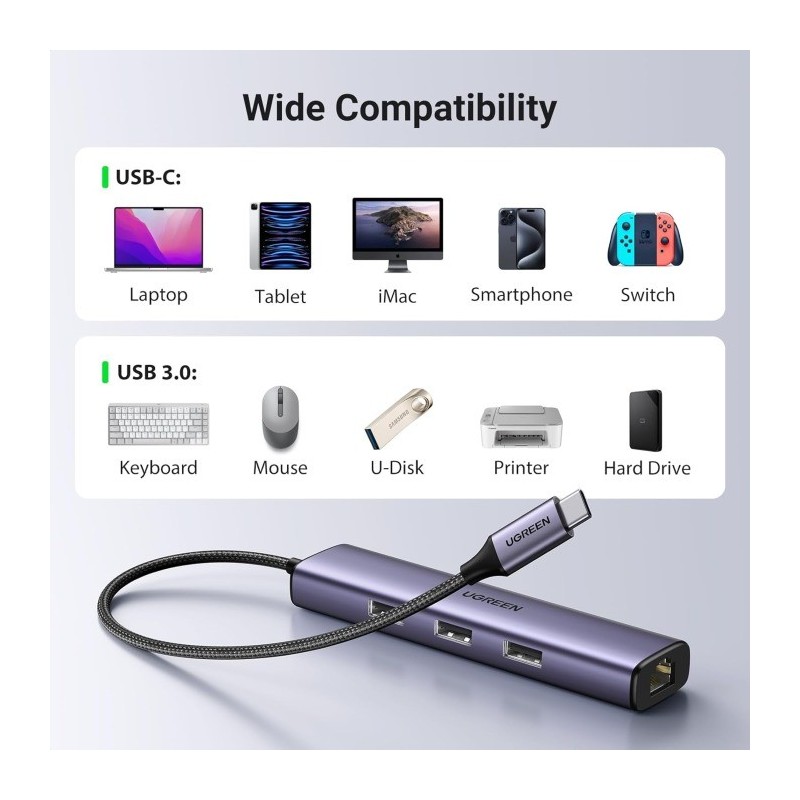 UGREEN USB C 4 v 1 Ethernet Hub je združljiv z večino naprav USB-C in Thunderbolt 3, kot so Macbooks, Mac Mini, iPad, iPhone 15/Plus/Pro/Max, Nintendo Switch, Steam Deck in druge. Ne potrebuje gonilnikov za Windows 11/10/8.1/8, Mac OS, iPad OS, Chrome OS in Android. V sistemih Windows XP/7/Vista in Linux je potrebna namestitev gonilnika, ki ga lahko preprosto namestite z našimi