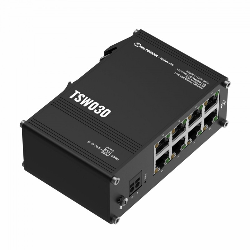 Teltonika TSW030 je kompaktno in zanesljivo 8-portno Ethernet stikalo, namenjeno industrijski uporabi. Opremljeno je z osmimi 10/100 Mbps RJ45 priključki in omogoča enostavno montažo na DIN letev, kar poenostavlja namestitev v nadzorne omare ali panele. Naprava deluje po principu plug-and-play, zato ne zahteva dodatne konfiguracije. Zaradi nizke porabe energije (0,5 W v mirovanju in do 1,5 W pri obremenitvi) je primerna za energijsko učinkovite sisteme. Robustno kovinsko ohišje iz anodiziranega aluminija zagotavlja dolgo življenjsko dobo ter odpornost na zahtevne industrijske pogoje.