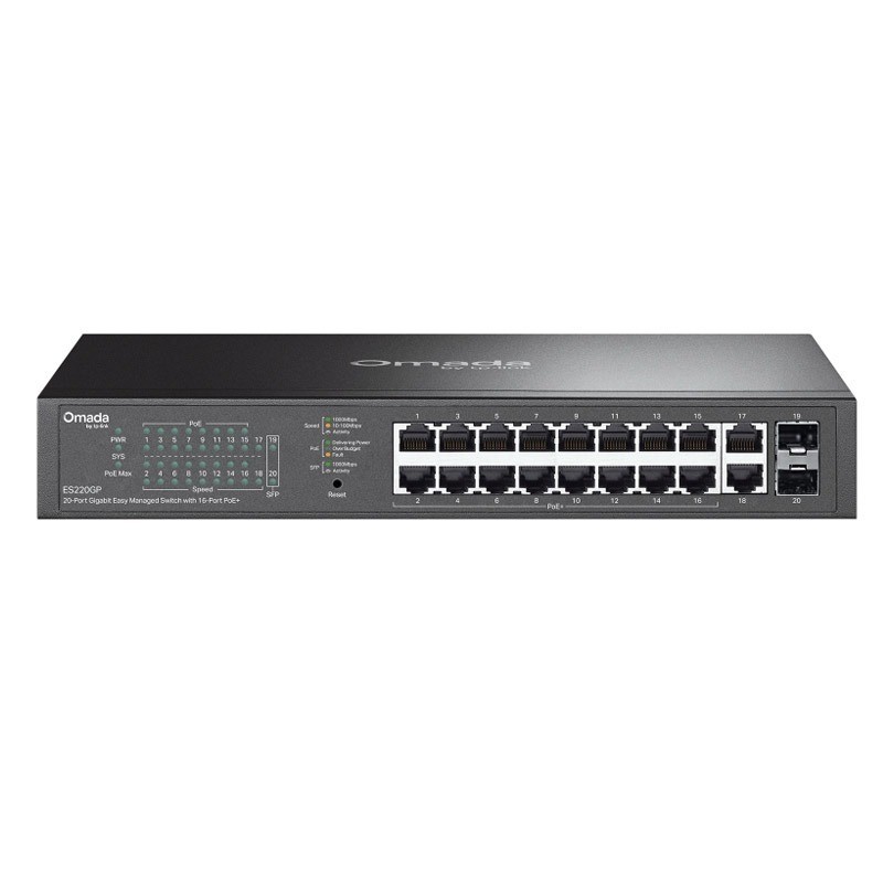 TP-LINK Omada ES220GP je zmogljivo 20-portno gigabitno upravljano mrežno stikalo, namenjeno profesionalnim omrežjem, manjšim podjetjem in nadzornim sistemom, ki potrebujejo stabilno PoE+ napajanje ter centralizirano upravljanje. Stikalo je opremljeno s 16 gigabitnimi RJ45 priključki s podporo za PoE+ (802.3af/at), ki lahko vsak port napajajo z do 30 W, ter dvema gigabitnima SFP režama za optične povezave. Skupni PoE proračun znaša 150 W, kar omogoča zanesljivo napajanje IP kamer, dostopnih točk in drugih PoE naprav.